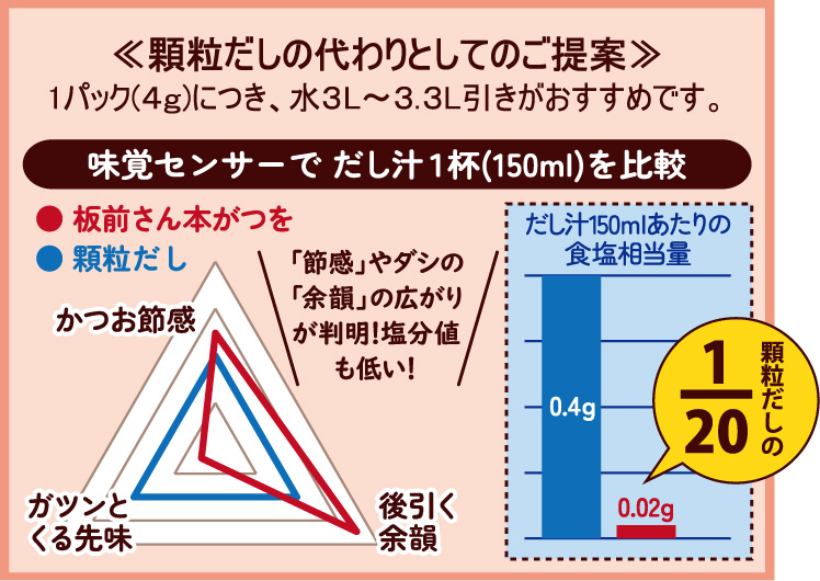 【板前さん本がつを28P】(水3~3.3Lに1パック(4g))と『顆粒だし』(水150mlに1g)の比較において、【板前さん本がつを28P】の方がかつお出汁の「節感」や「余韻」に広がりがあることが数値的にも判明しました(自社調べ)
